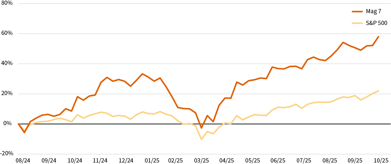 Prestaties van de “Magnificent Seven” en de bredere S&P 500: augustus 2024 – oktober 2025